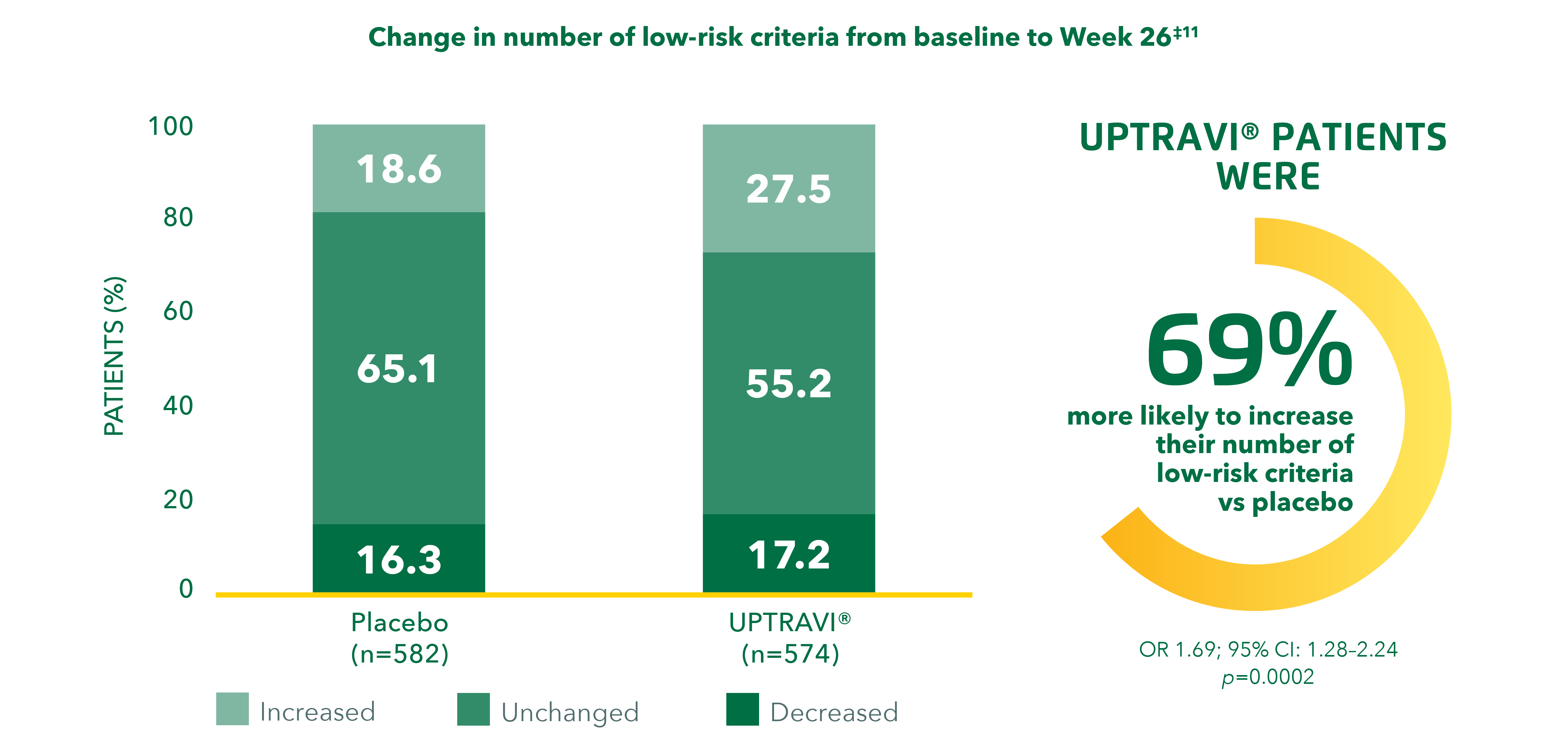 In the GRIPHON trial, patients receiving UPTRAVI® were 69% more likely to improve their risk status from baseline to Week 26 compared with placebo.*‡
