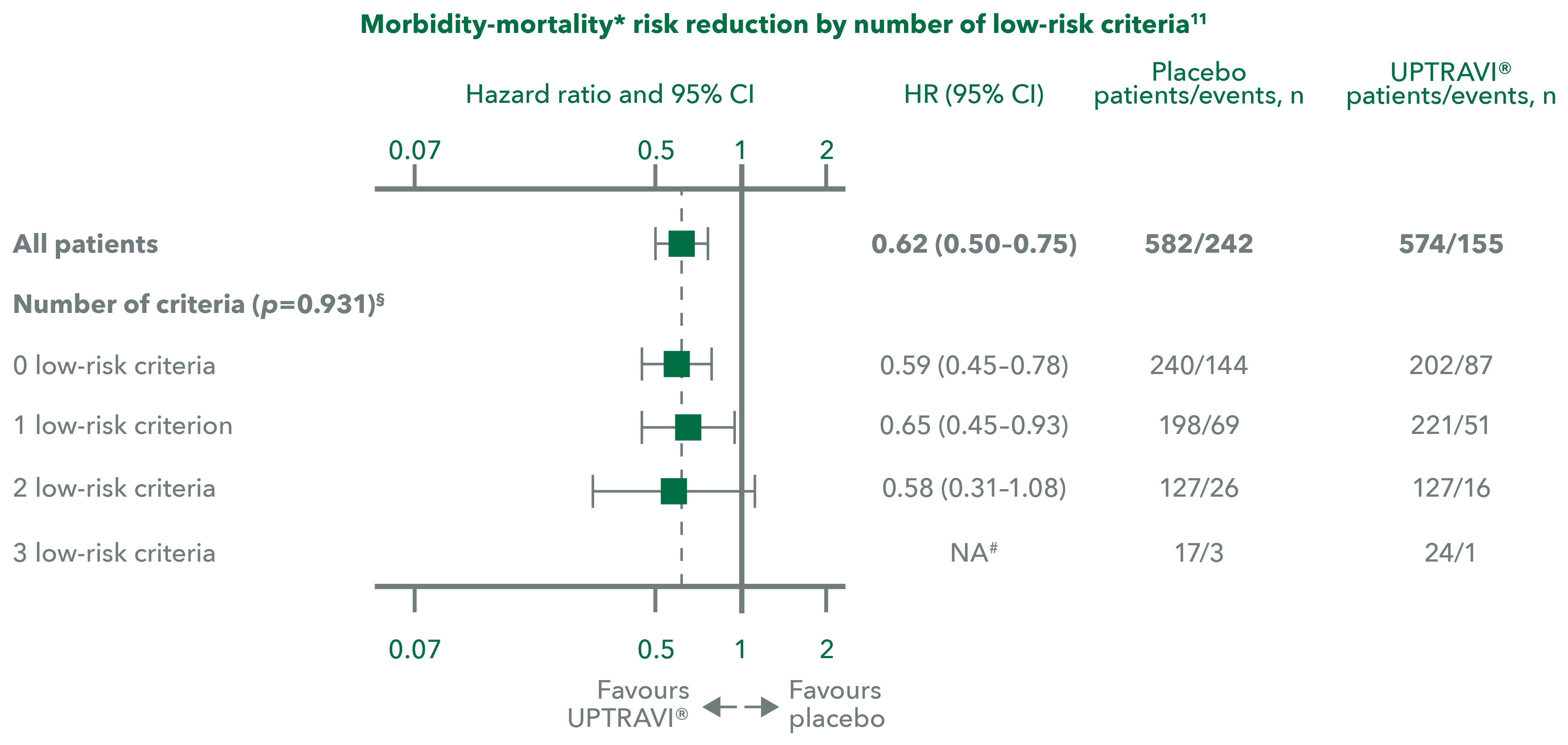 UPTRAVI® reduced the risk of disease progression by 41%, 35% and 42% in the subgroup of patients with 0, 1 and 2 low-risk criteria, respectively, compared with placebo.*