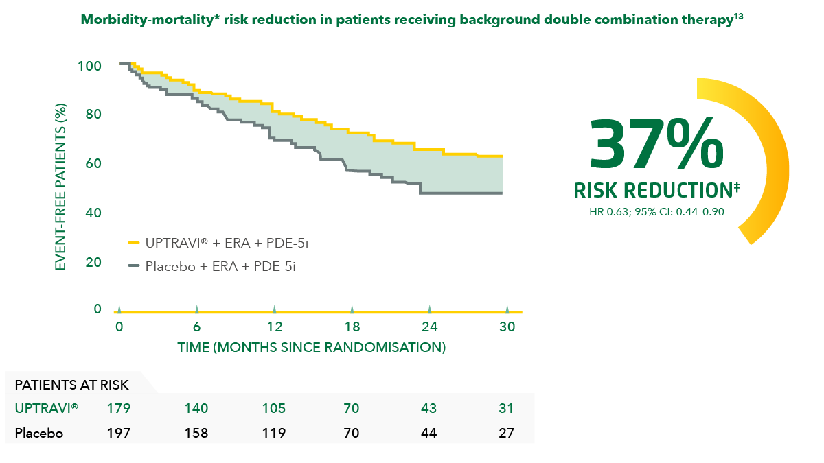 Adding UPTRAVI® to double combination therapy reduced the risk of disease progression by 37% vs placebo in the overall population.