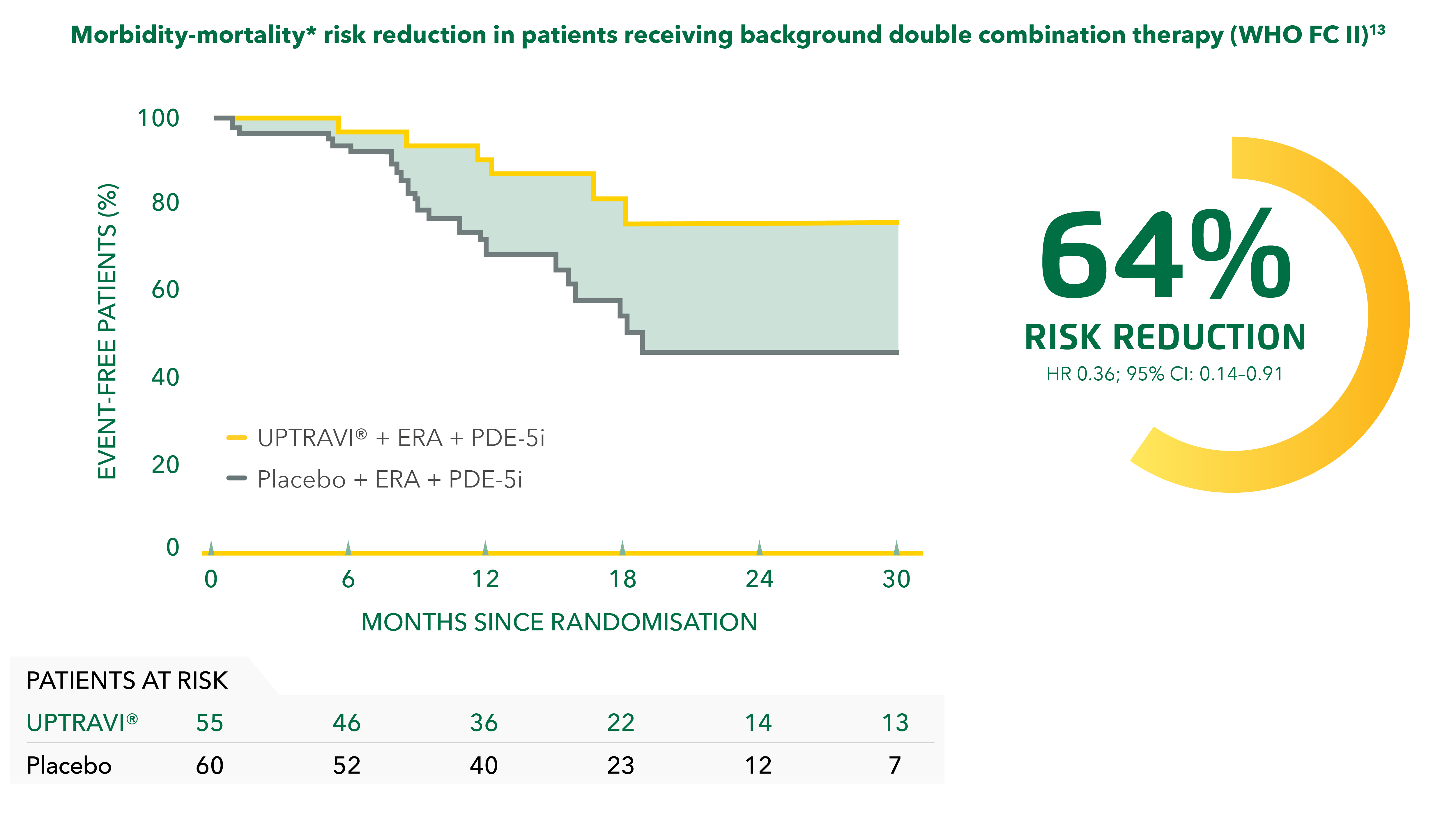 Adding UPTRAVI® to double combination therapy reduced the risk of disease progression by 64% vs placebo in WHO FC II patients.