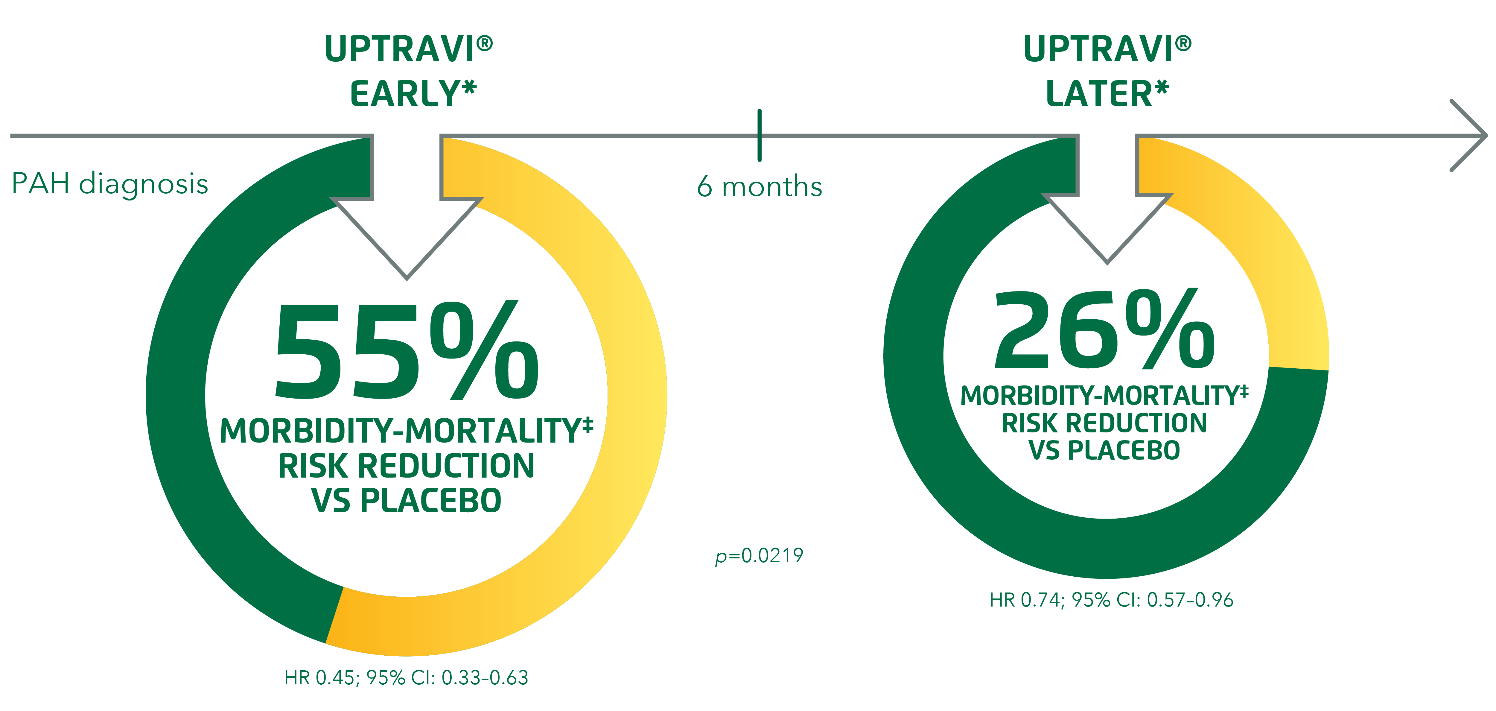 Early* initiation of UPTRAVI® improved long-term outcomes vs placebo to a greater degree than when initiated later.* Treatment with UPTRAVI® reduced the risk of disease progression vs placebo when initiated within 6 months of diagnosis and when initiated after 6 months from diagnosis.