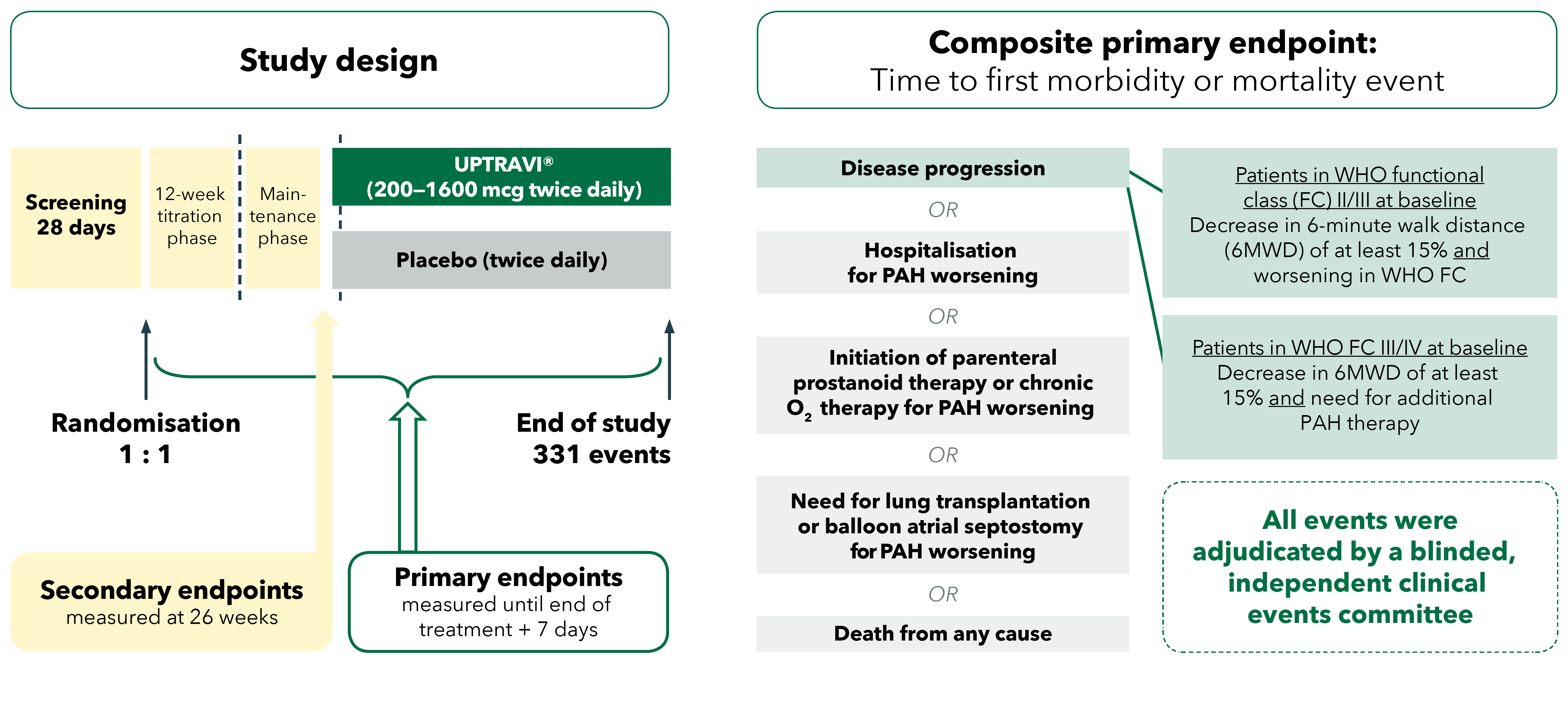 The GRIPHON trial was a multicentre, double-blind, randomised, parallel-group, placebo-controlled, event-driven Phase 3 trial that assessed the safety and efficacy of UPTRAVI® across a broad range of patients with PAH. UPTRAVI® efficacy was demonstrated using a composite long-term outcomes primary endpoint that included PAH-related hospitalisation, disease progression events and death.